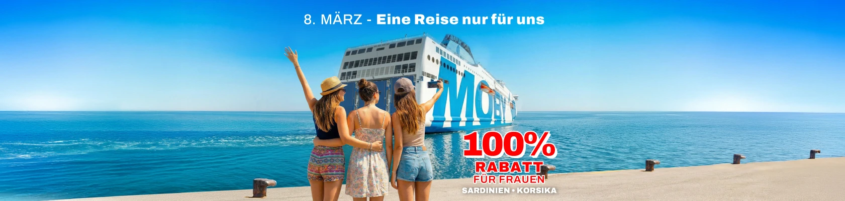 Zum Weltfrauentag bieten Ihnen Moby und Tirrenia ein besonderes Geschenk: Bei Buchungen vom 06.03.2026 bis zum 08.03.2026 erhalten Sie 100 % Rabatt auf den Passagiertarif für einen Erwachsenen, wenn dieser von mindestens einem Kind im Alter von 4 bis 11 Jahren oder einem zweiten zahlenden Erwachsenen begleitet wird.Für Abfahrten nach Sardinien und Korsika bis zum 31.12.2026. Das Angebot unterliegt Einschränkungen und gilt nur für ausgewählte Abfahrten mit eingeschränkter Verfügbarkeit.